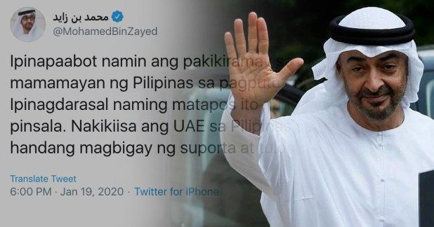UAE support even reached Philippine, Crown Prince of Abu Dhabi and Deputy Supreme Commander of the UAE Armed Forces, Mohamed bin Zayed Al Nahyan, took to twitter after the Taal volcano erupted.