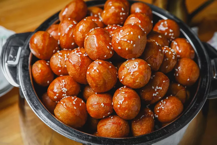 These are sweet dumplings from milk, sugar, butter, and flour, fried and covered in date syrup.