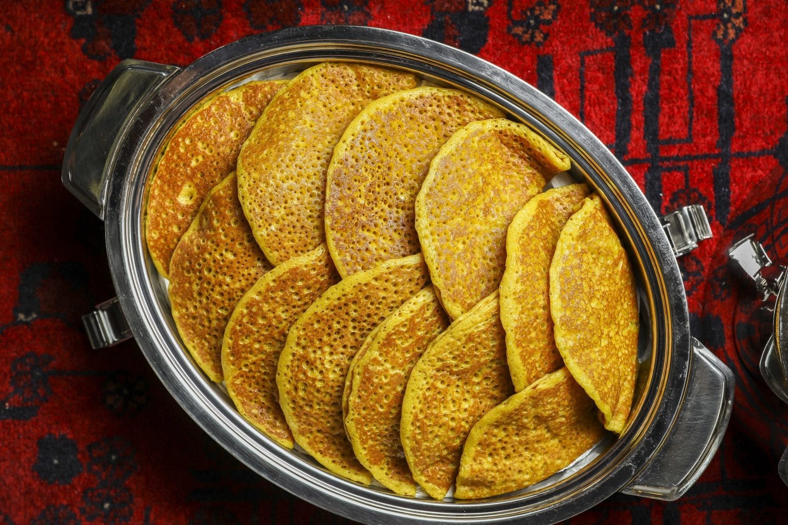 Chebab Bread, a thin, crisp, and sweet bread that looks and feels a lot like an American pancake.