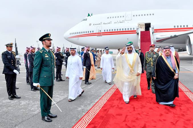 His Highness and his accompanying delegation were received at the King Abdulaziz Air Base by the Custodian of the Two Holy Mosques, King Salman bin Abdulaziz Al Saud, along with several Saudi Sheikhs and senior officials.
