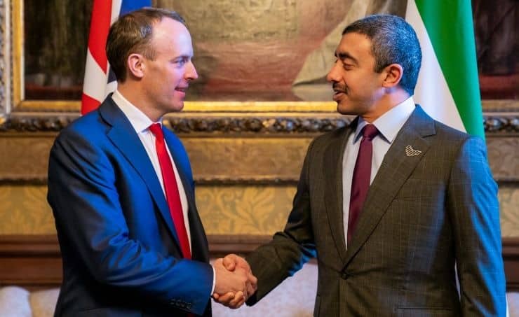 UAE Minister of Foreign Affairs and International Cooperation Shaikh Abdulla bin Zayed Al-Nahyan today met British Foreign Secretary Dominic Raab and discussed economic, trade and investment relations, in addition to regional and international developments, focusing on developments in Libya, Syria, Iraq and Iran.